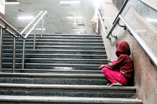 📷 चित्र में: दिल्ली के एक मेट्रो स्टेशन की सीढ़ियों पर भीख मांगती एक छोटी बच्ची।