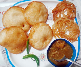called Ghughni, a stew made with red gram, and Jalebis, a popular sweet dish.