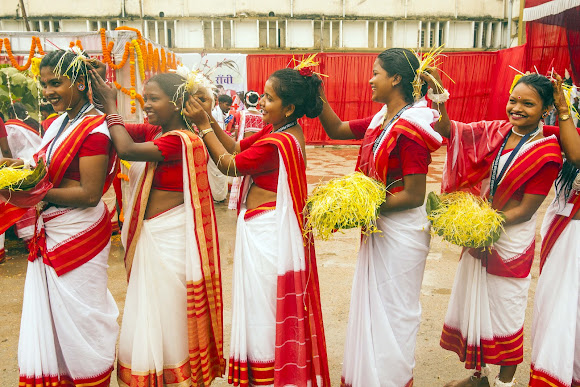 attire with Karam flowers tucked in their hair, dance gracefully in