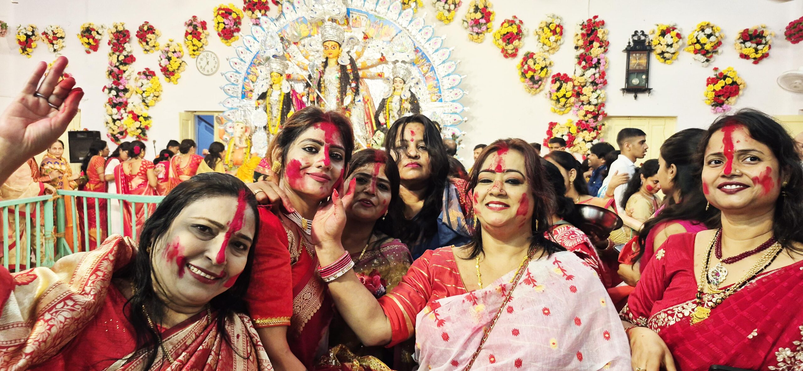 Bangalies Women in vibrant Sarees celebrating Sindoor Khela at Durga Bari in Ranchi.