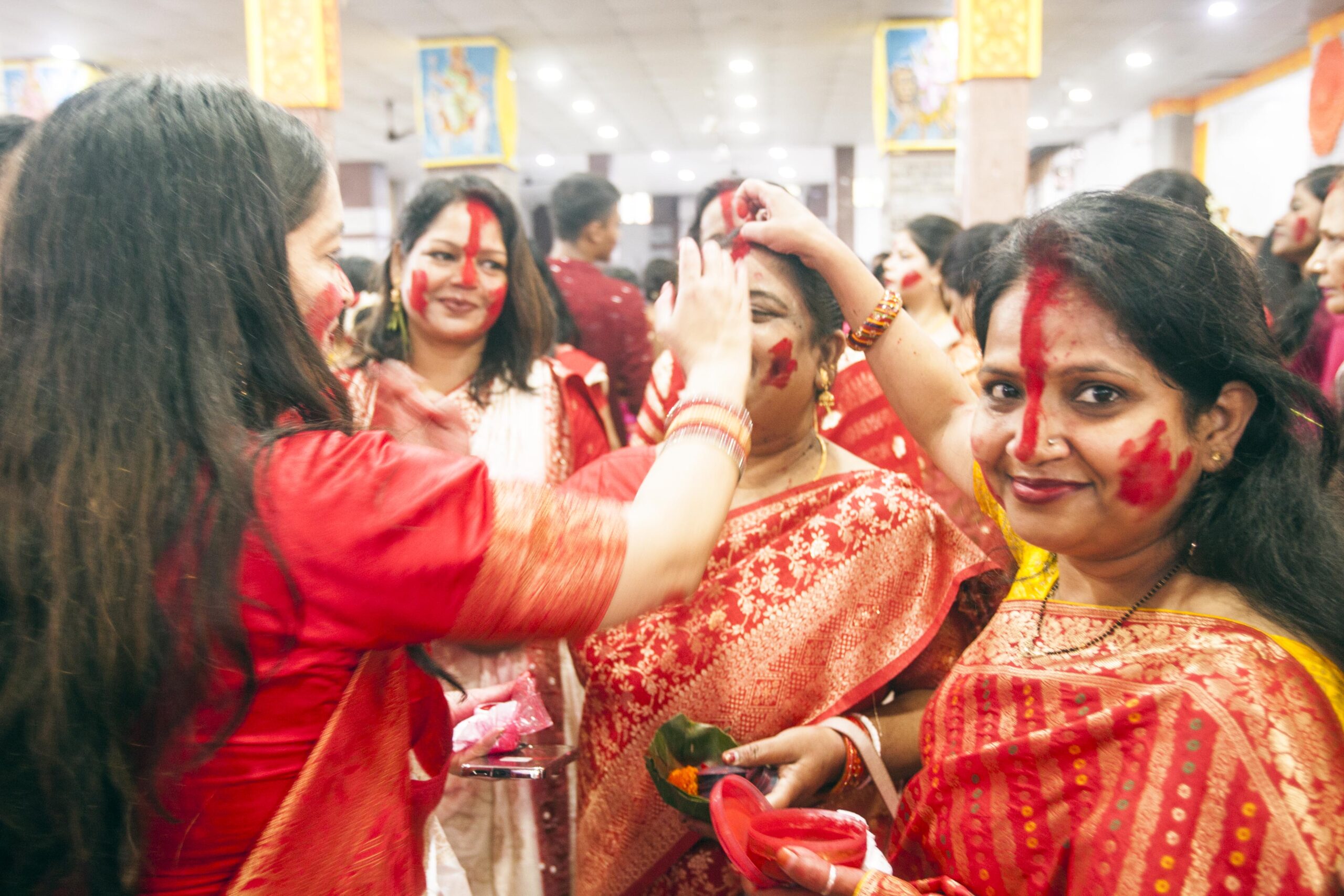 Bengali women smear Sindoor to each other on the occasion of Vijaya Dashmi at Durga Bari in Ranchi.